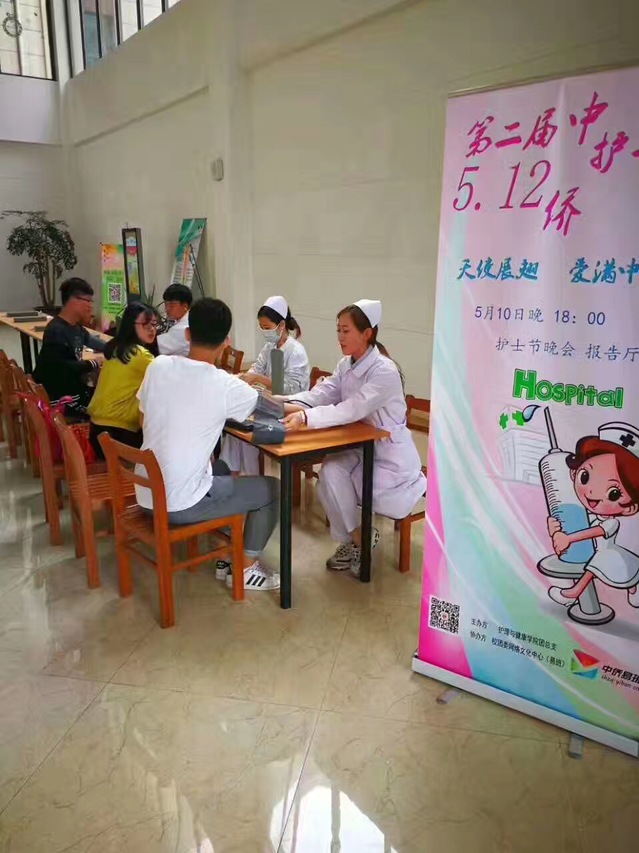 5月8日中午,伴着淅淅沥沥的小雨,未来的白衣天使为全校师生进行了“校园健康行动”——测量血压,守护健康。受到了全校师生的一致好评。