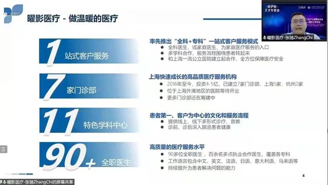 随后,曜影医疗品牌总监张驰作为受邀医院代表发言。并就医院基本情况、发展现状、人才岗位需求等做了详细介绍。张总监指出曜影医疗不断强化内涵建设,创新发展模式,致力于打造卓越的品牌医疗机构,他希望这次线上交流会能促进医院与学院在人才培养、实习实训、人才就业等方面的合作,双方能达成“合作共赢,共谋发展”的共识,加强在人才培养、科学研究、校园招聘、实习实训、就业指导等方面的交流与合作,实现共赢发展。最后,张总监围绕医院用人需求、毕业生的评价反馈等方面与同学们进行交流。