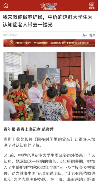 暑假期间,我校全国三下乡“投身乡村振兴,助力健康中国”专项团队——“让老有所依照进现实”为老志愿服务队得到”青春上海News“报道,并刊发在”上海青年报“”喜迎二十大、永远跟党走、奋进新征程“主题教育实践活动专栏。