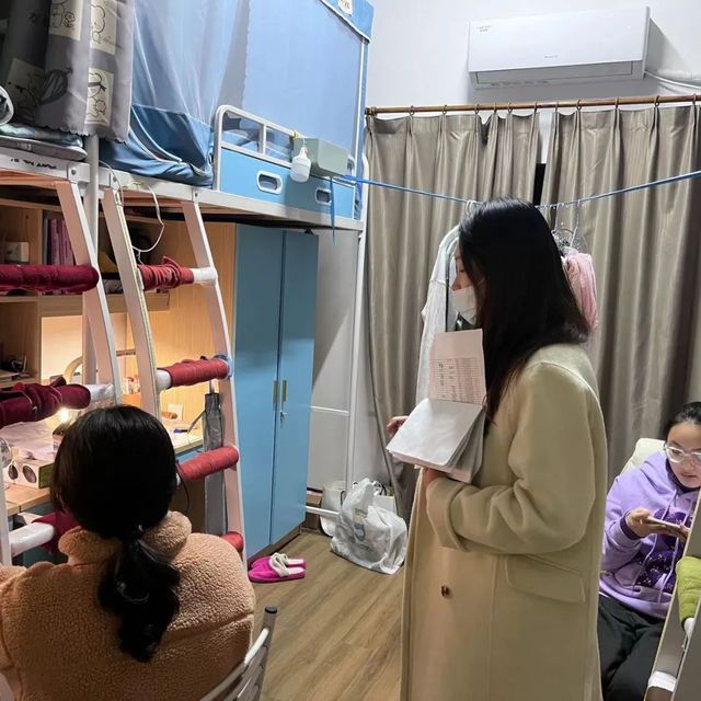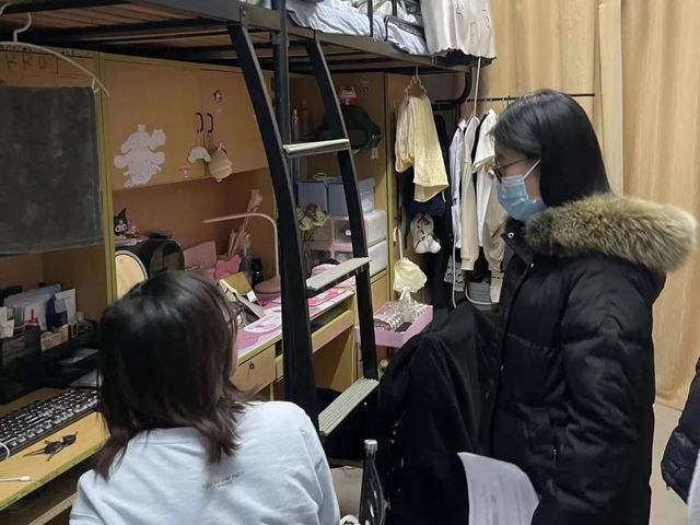 新学期伊始,同学们陆续返校。为及时进行宿舍安全教育、摸排学生到校情况,以及了解同学们的新学期新展望,护理与健康学院的郭帆老师、周华丽老师、陶丽老师和刘艳艳老师深入学生宿舍,进行了走访检查。