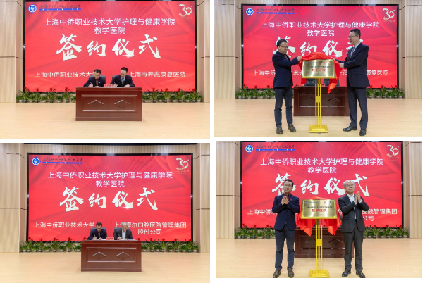 上海中侨职业技术大学护理与健康学院院长张捷、上海市养志康复医院副院长柴小军及摩尔口腔集团董事长王三矛举行共建签约和揭牌仪式。