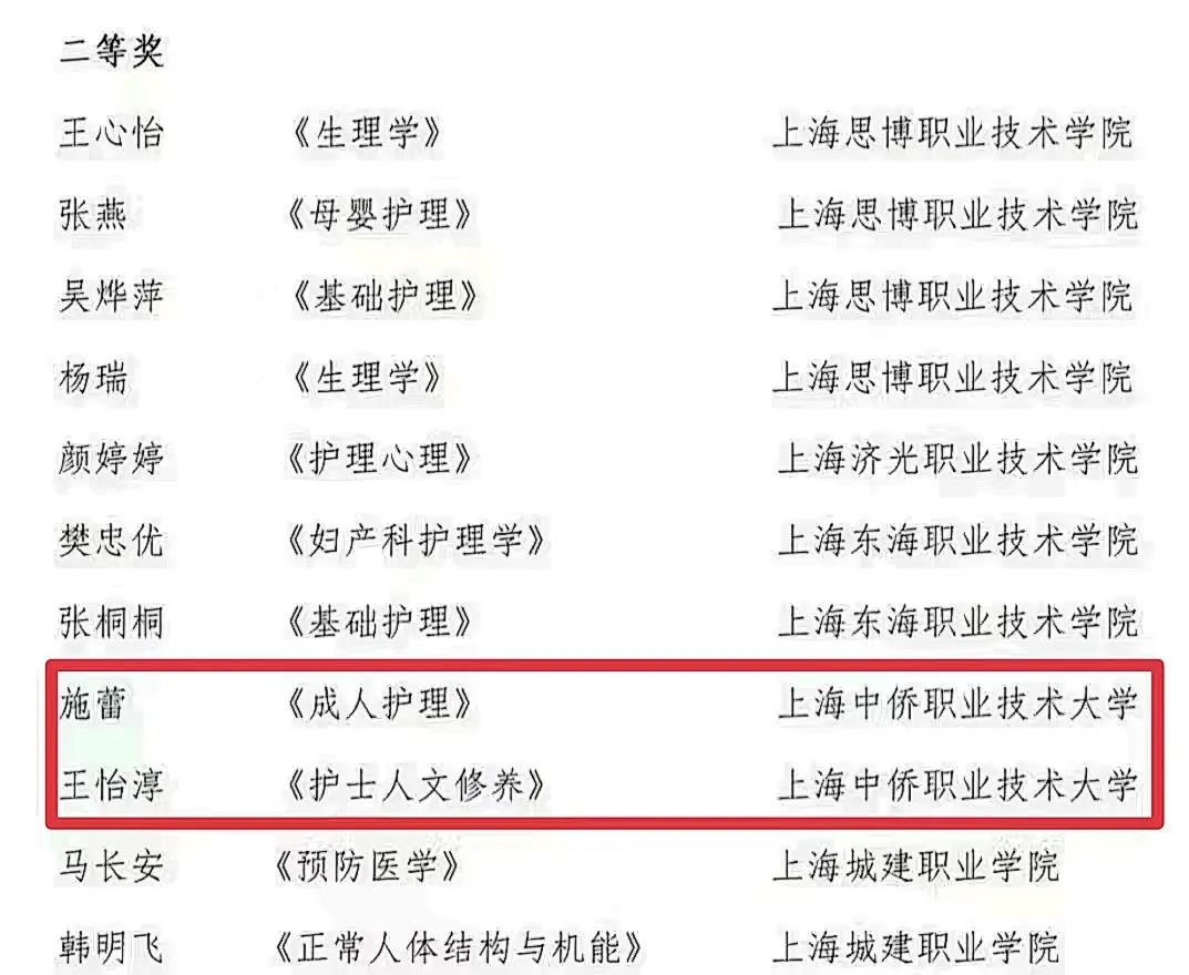 为进一步推动护理与健康学院教学质量的改革与创新,促进护理与健康学院的教学发展,我院教师积极参加了上海市医药健康类专业教职委教师优质课评选。在激烈的比拼过后,施蕾老师的《成人护理》及王怡淳老师的《护士人文修养》荣获了2023年医药健康类专业教职委教师优质课评选二等奖。
