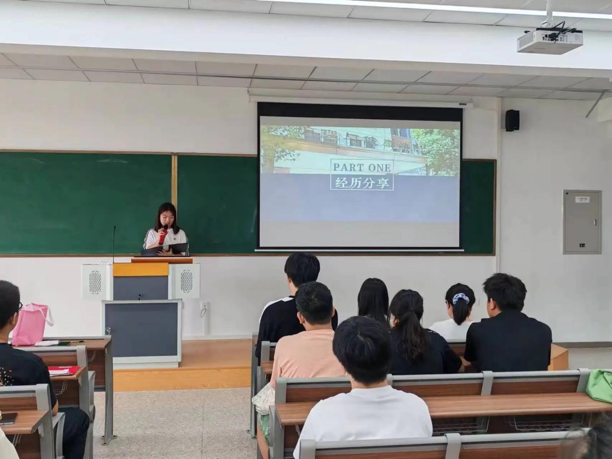 紧接着,由我院学生会主席团成员徐奕萍向新生们分享了自己在校学习、生活方面的经历。她强调专业学习的重要性,并鼓励大家积极参与学科竞赛,努力用行动把专业知识付诸实践。