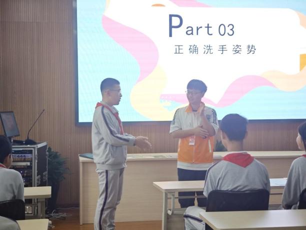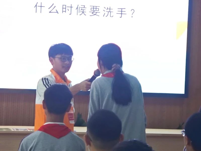 最后,志愿者们为同学们表演了洗手操,以节目的形式展示了洗手的正确步骤,并鼓励同学们跟随志愿者的动作一起摆动双手。