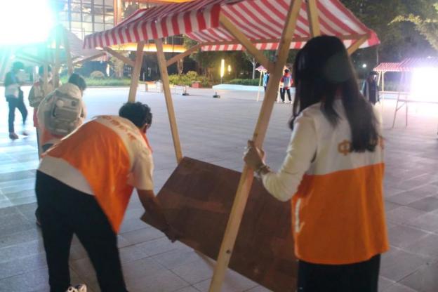 在活动开始前,志愿者们有序的分工合作,他们彼此配合默契,积极开展搬运摊铺、桌椅等工作,为后续的夜市的开展提供了坚实的基础。