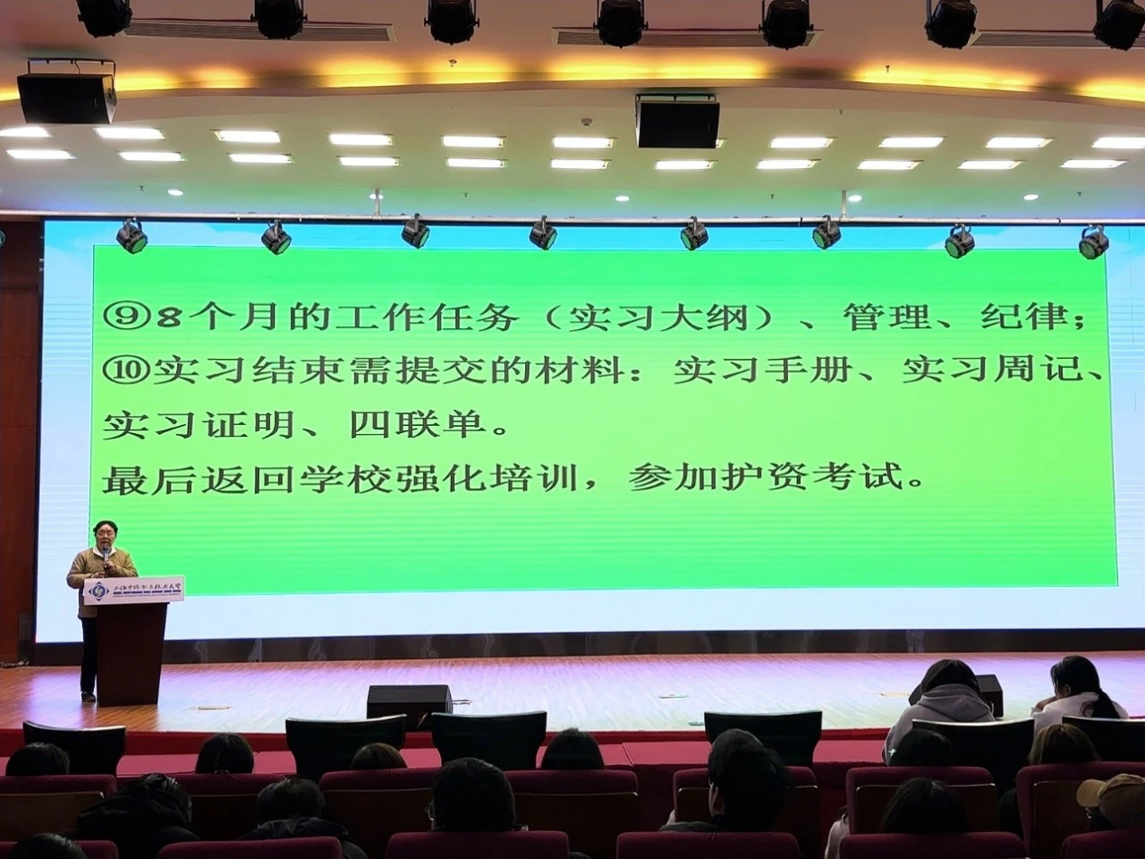 随后,陈伟光老师提醒同学们在实习期间要严格跟随带教老师的安排,遵守医院的请假制度。她强调,实习期间属于医院和学校的双重管理,有任何问题及时和带教老师沟通,确保实习工作顺利完成。同时,她还就护士资格证的考试时间节点对同学们进行提醒,建议同学们在实习期间合理安排时间,在学业和实习之间找到平衡。
