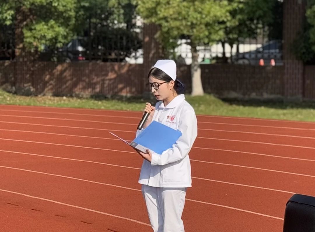 随后,护理与健康学院团委、学生会主席团成员刘其同学进行国旗下讲话,她通过分享自身经历呼吁同学们要树立远大理想,以积极向上的姿态投入学习与生活,传递青春正能量,始终以“真诚、博爱、厚德、敬业”院训精神勉励自己,用实干与奉献诠释新时代青年的责任与担当,让院训精神在实践中熠熠生辉。