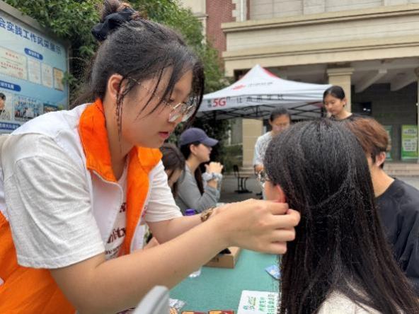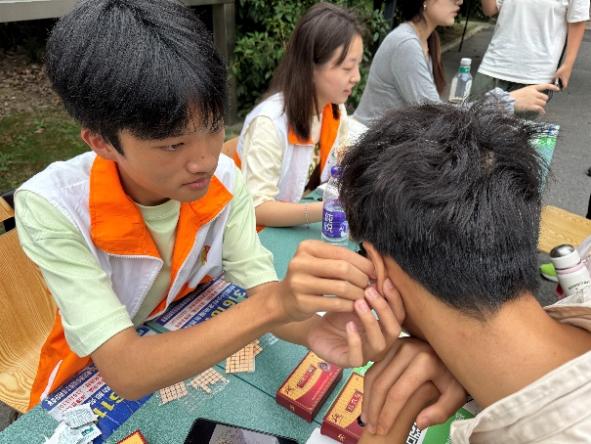 在耳穴压豆体验区,同学们一边认真感受按压耳部穴位时的酸胀感,一边聆听志愿者讲解穴位功效。大家纷纷表示收获颇丰,不仅亲身体验到中医保健缓解失眠、头痛等问题的作用,也进一步加深了同学们对中医理论的认识。