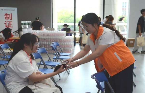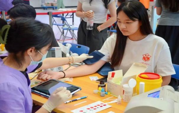 在志愿者的引导下,献血师生有序签到,规范测量血压,进行抽血化验,整个流程有条不紊。