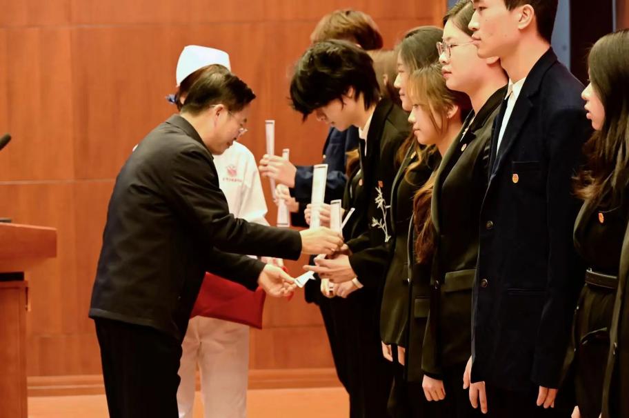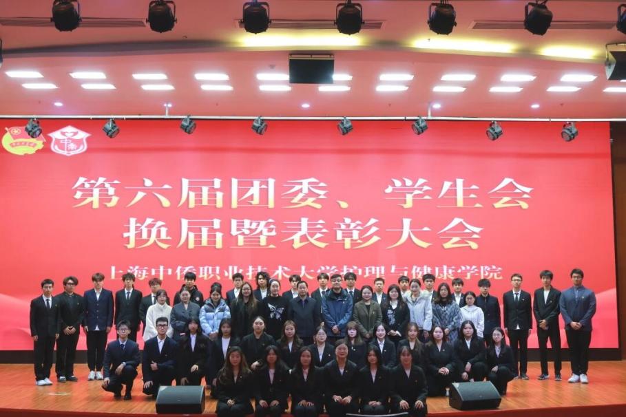 20251221900,上海中侨职业技术大学护理与健康学院第六届团委、学生会换届暨表彰大会于图文信息楼二楼报告厅成功举行。出席本次大会的有护理与健康学院院长于有江、副院长曹雪楠、校团委副书记薛飞、直属党支部副书记郭帆、团委书记朱心怡、全体辅导员、兄弟学院主席团成员、第六届团委、学生会全体干部及干事。本次换届大会由23护理本科3班卢奕锋、24护理本科1班曾锦溢主持。